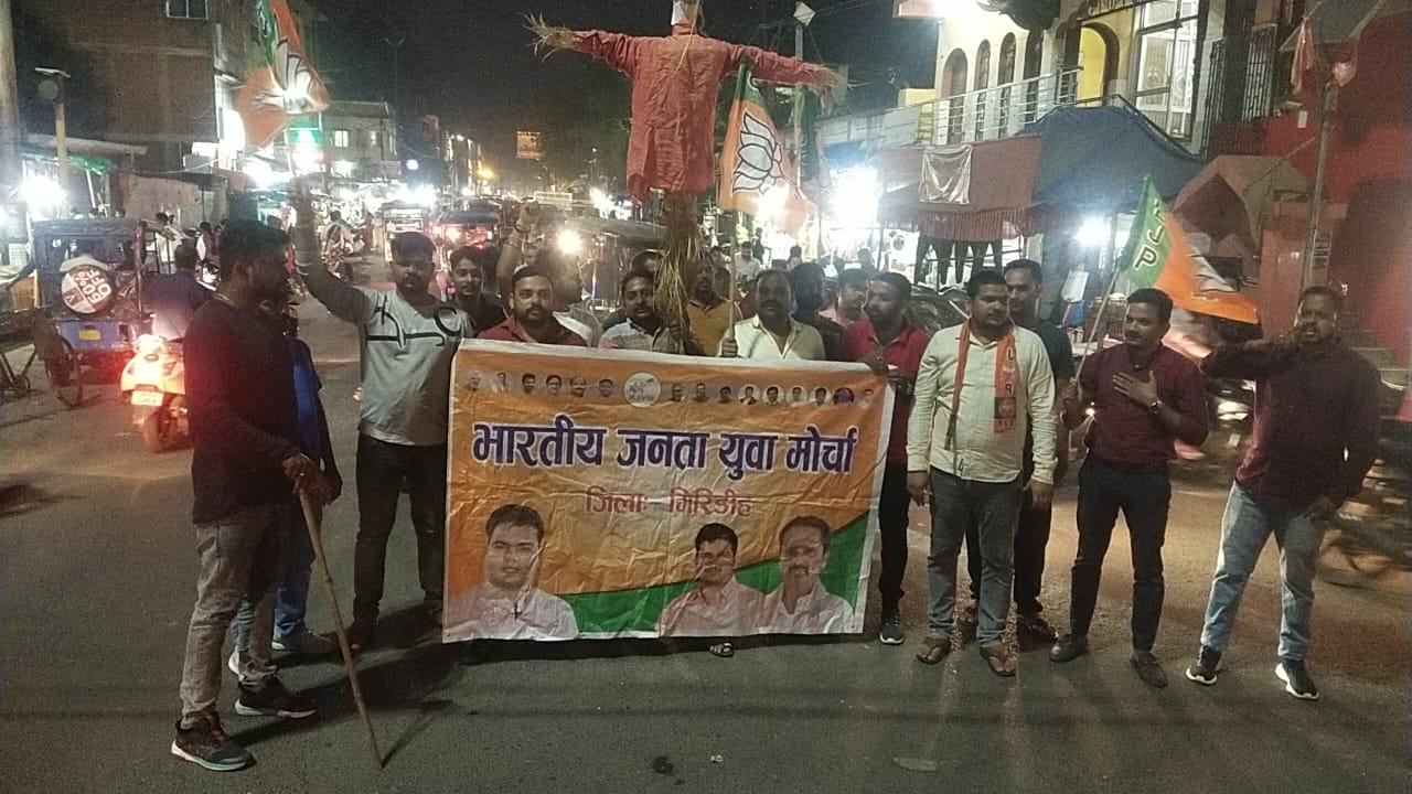 जिसके विरोध में आज भारतीय जनता युवा मोर्चा गिरिडीह द्वारा आज झंडा मैदान से चलकर टावर चौक पहुंच कर मुख्यमंत्री हेमंत सोरेन का पुतला दहन किया गया । और इसकी जांच की मांग किया गया ।और दोषियों पर करवाही नही होने पर सड़क से लेकर सदन तक चरणबद्ध आंदोलन किया जाएगा । कार्यकर्म में मुख्य रूप से जिला अध्यक्ष रंजीत कुमार राय ,महामंत्री मिथुन चंद्रवंशी , संभू शर्मा , प्रदेश कार्यसमिति सदस्य संजीव कुमार ,नगर अध्यक्ष विवेक गुप्ता , मंडल अध्यक्ष सुभम पांडेय , आलोक सिन्हा गोतम भादानी आलोक केसरी अमित आर्य सोनू कुमार , अमित तटीय रंजीत राय किसान मोर्चा प्रदेश मंत्री कुमार सौरव उप प्रमुख ओमकार पंकज कुमार आदि कई मोर्चा के कार्यकर्ता उपस्थित थे |