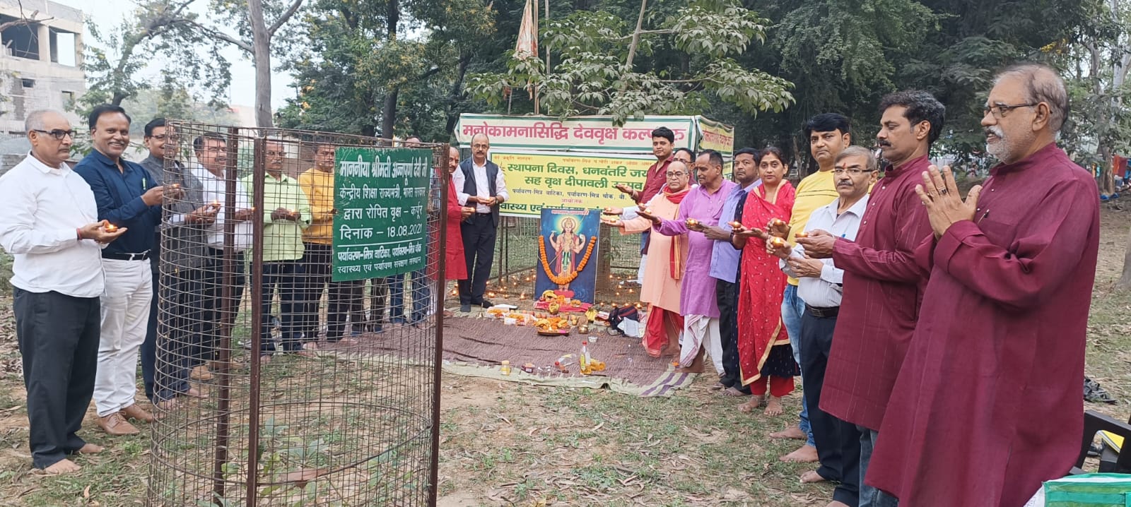 बोकारो : ‘स्वास्थ्य एवं पर्यावरण संरक्षण संस्थान’ का स्थापना दिवस हर वर्ष की भांति इस वर्ष भी शुभ धनतेरस तिथि दिनांक 10.11.2023 को वृक्ष दीपावली के रूप में संस्थान द्वारा बोकारो के पर्यावरण-मित्र चौक स्थित पर्यावरण-मित्र वाटिका में आयोजित किया गया । इस अवसर पर अपराह्न 3.30 बजे पर्यावरण-मित्र वाटिका में स्थित मनोकामनासिद्धि देववृक्ष कल्पतरु स्थल पर भगवान धन्वंतरि की विधिवत पूजा अर्चना कर बोकारो सहित सम्पूर्ण देश वासियों के लिए मंगलकामनाएं करते हुए सबों के उत्तम स्वास्थ्य के लिए भगवान से आशीर्वाद मांगा गया और मनोकामनासिद्धि प्रार्थना की गई । तत्पश्चात संस्थान के संस्थापक ब्रम्हलीन पर्यावरण-मित्र पं. गौरी शंकर ओझा जी की पर्यावरण-मित्र चौक पर स्थित तस्वीर के ऊपर माल्यार्पण कर वहां दीप प्रज्वलित किया गया फिर इस वाटिका स्थित सैकड़ों वृक्षों के नीचे दीपक जलाकर उनके प्रति आभार व्यक्त करते हुए भव्य वृक्ष दीपावली मनाई गई । इस अवसर पर संस्थान के महासचिव शशि भूषण ओझा ‘मुकुल’ ने कहा कि संस्थान की स्थापना वर्ष 1987 ई. में शुभ धनतेरस तिथि को हुई थी तबसे हर वर्ष आज स्थापना दिवस का भव्य आयोजन वृक्षों के नीचे सैकड़ों दीप जलाकर वृक्ष-दीपावली के रूप में किया जाता है साथही स्वास्थ्य के देवता भगवान धन्वंतरि की भी पूजा की जाती है और