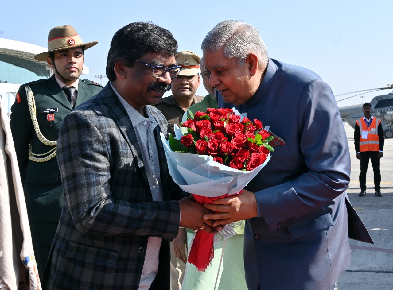 रांची : उपराष्ट्रपति बनने के बाद पहली बार जगदीप धनखड़ रविवार को रांची पहुंचे। धरती आबा भगवान बिरसा मुंडा की पावन भूमि पर उपराष्ट्रपति का बिरसा मुंडा हवाई अड्डा पर राज्यपाल सीपी० राधाकृष्णन और मुख्यमंत्री हेमन्त सोरेन सहित अन्य अधिकारियों ने उनका स्वागत किया।