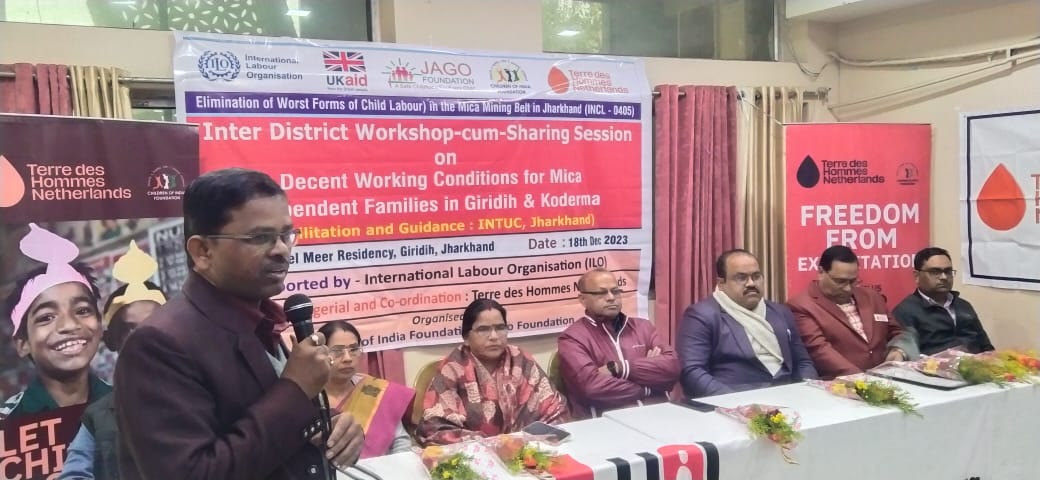गिरिडीह : इंटरनेशनल लेबर आर्गेनाइजेशन, टी डी एच निदरलैंड, चिल्ड्रन ऑफ इंडिया फाउंडेशन और जागो फाउंडेशन के सहयोग से दो दिवसीय कार्यशाला का समापन आयोजन मीर होटल में कया गया । यह कार्यक्रम कोडरमा और गिरिडीह मे माइका आश्रित परिवार को शशक्त बनाने एवं उनके बच्चों किस प्रकार शिक्षा से जुड़ाव कर सकें इसके लिए किया गया ।