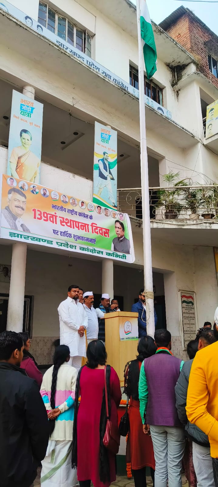 रांची : प्रदेश कांग्रेस ने पार्टी के 139वां स्थापना दिवस रांची स्थित कार्यालय में गुरुवार को धूमधाम से मनाया। प्रदेश कांग्रेस के कार्यकारी अध्यक्ष बन्धु तिर्की ने झण्डोत्तोलन किया और गार्ड ऑफ ऑनर सेवादल के प्रदेश महासचिव छोटू सिंह ने दी। मौके पर बन्धु तिर्की ने सभी को कांग्रेस स्थापना दिवस की बधाई देते हुए कहा कि 138 वर्ष पूर्व 28 दिसम्बर 1885 को स्थापित कांग्रेस की चुनौती आज बहुत बढ़ गयी है। देश को विभाजनकारी शक्तियों के साथ ही अलगाववादी विचारधारा से बचाना और उन मूल्यों की रक्षा करना हम कांग्रेसियों की बहुत महत्वपूर्ण जिम्मेदारी है, जिसके आधार पर स्वतंत्रता की लडाई लड़ी गयी और आजादी के तत्काल बाद देश का महानिर्माण शुरू हुआ।