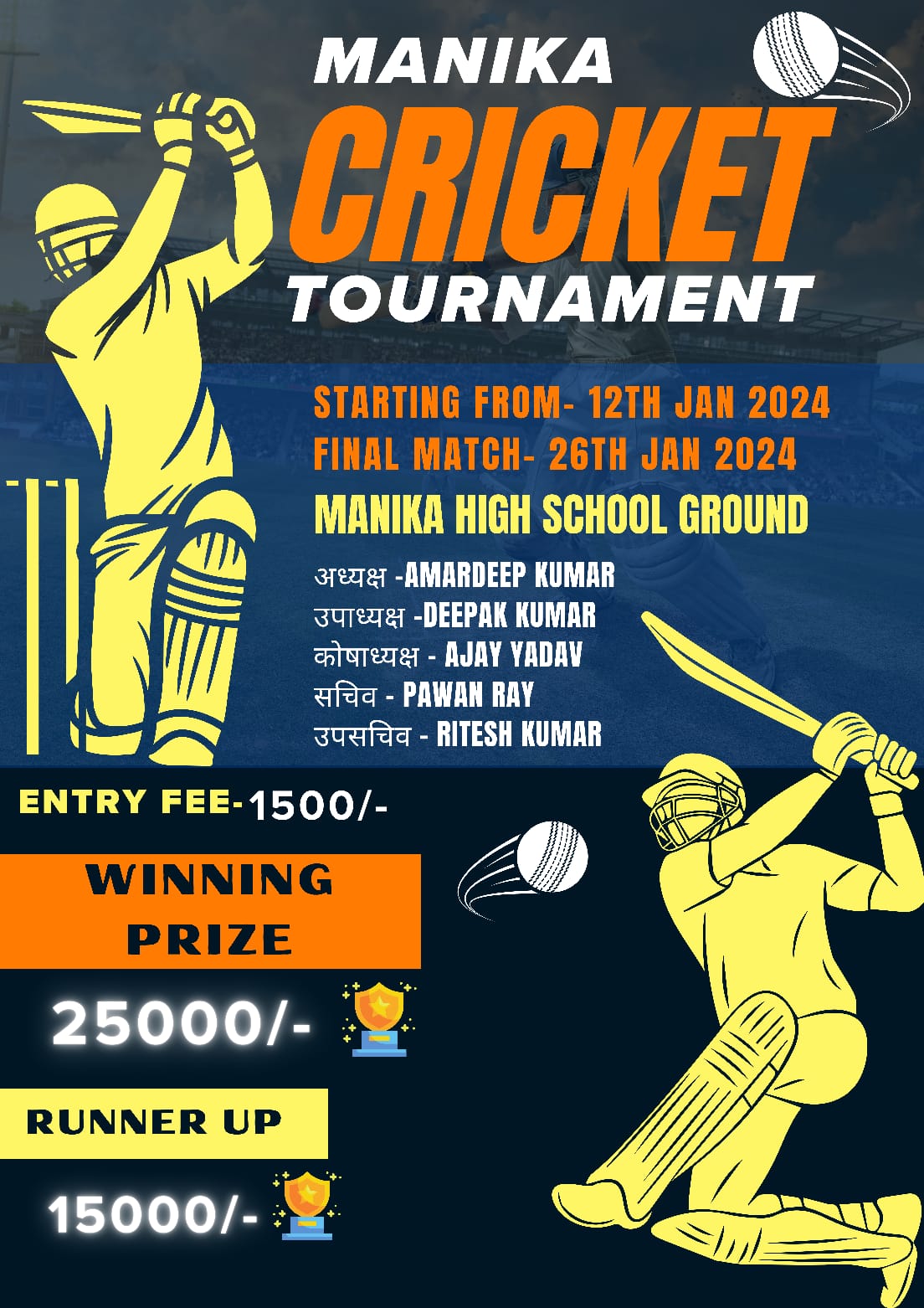मनिका : प्रखंड मुख्यालय स्थित हाई स्कूल के खेल के मैदान में प्रत्येक वर्ष की भांति इस वर्ष भी 12 जनवरी से 26 जनवरी तक भावी क्रिकेट टूर्नामेंट का आयोजन किया जा रहा है इस वर्ष विजेता टीमों के लिए इनाम में बढ़ोतरी की गई है प्रथम स्थान प्राप्त करने वाले विजेता टीम को₹25000 नगद कप एवं मेटल द्वितीय स्थान प्राप्त करने वाले उपविजेता टीम को₹15000 नगद कप एवं मैडल देकर पुरस्कृत किया जाएगा क्रिकेट टूर्नामेंट कमेटी के अध्यक्ष अमरदीप कुमार सचिन पवन राय ने बताया कि टूर्नामेंट में हिस्सा लेने के लिए प्रवेश शुल्क ₹1500 रखे गए हैं जो भी खिलाड़ी इस टूर्नामेंट में हिस्सा लेना चाहते हैं व 93342 3318 मोबाइल नंबर पर संपर्क कर सकते हैं।