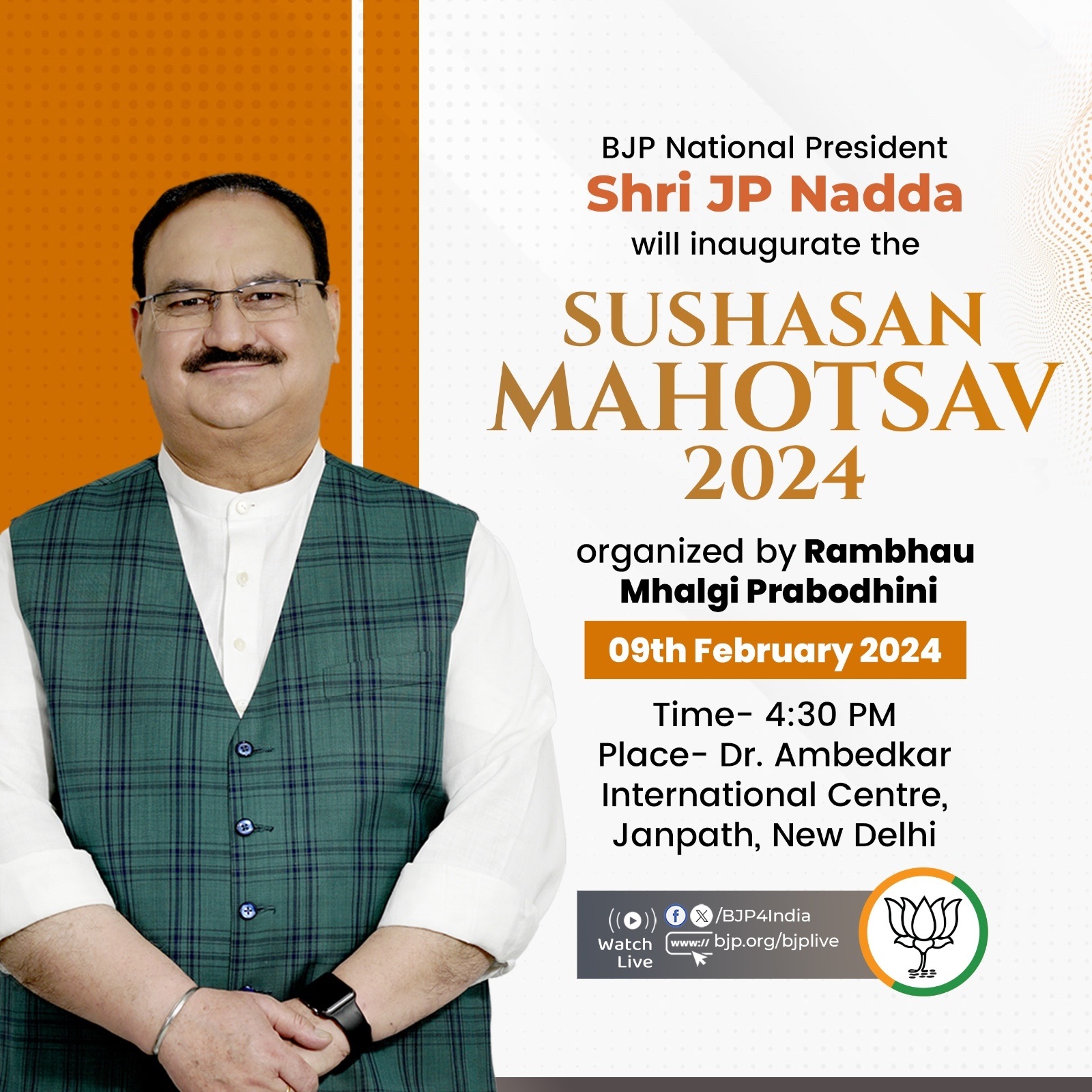 नई दिल्ली : भारतीय जनता पार्टी (भाजपा) के राष्ट्रीय अध्यक्ष जेपी नड्डा आज (शुक्रवार) शाम साढ़े चार बजे राष्ट्रीय राजधानी के आम्बेडकर इंटरनेशनल सेंटर में दो दिवसीय ‘सुशासन महोत्सव 2024’ का उद्घाटन करेंगे। यह जानकारी (संक्षिप्त और सचित्र) भाजपा ने अपने एक्स हैंडल पर साझा की है। ‘सुशासन महोत्सव 2024’ का आयोजन रामभाऊ म्हालगी प्रबोधिनी ने किया है।
