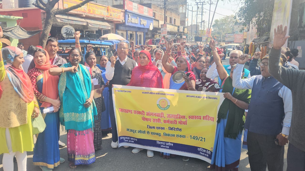 गिरिडीह : झारखंड मजदूर मोर्चा के बैनर तले शनिवार को सैकड़ो महिला कर्मी झण्डा मैदान में एकजुट होकर थाली बजाकर दो सूत्री मांगों को लेकर प्रदर्शन की। जिसके बाद शहरी क्षेत्र में रैली निकाली गई। रैली के माध्यम से आंगनबाड़ी स्वास्थ्य सहिया जल सहिया और पोषण सखी ने सरकार के प्रति रोष प्रकट करते हुए थाली बजाकर सरकार से अपनी मांगों को पूरा करने को लेकर आवाज़ बुलंद की।