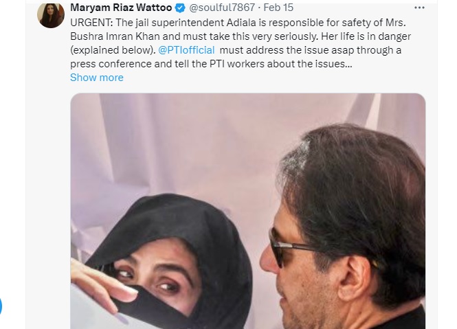 लंदन : संगीन आरोपों में से कुछ में सजायाफ्ता और जेल में बंद पाकिस्तान के पूर्व प्रधानमंत्री और पाकिस्तान-तहरीक-ए-इंसाफ के संस्थापक इमरान खान की साली मरियम रियाज वट्टू की 15 फरवरी को एक्स हैंडल पर की गई पोस्ट सुर्खियों में है। मरियम ने दावा किया है कि पाकिस्तान में उनकी बड़ी बहन बुशरा खान की जान को खतरा है। उसे बानी गाला में नजरबंद कर दिया गया है।