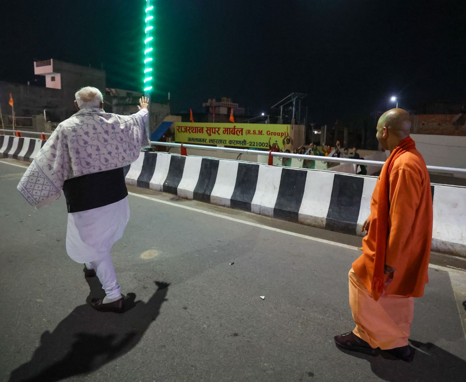 वाराणसी : गुजरात में पूरे दिन व्यस्त और लम्बे कार्यक्रम, हवाई सफर के बाद गुरुवार रात अपने संसदीय क्षेत्र वाराणसी पहुंचे प्रधानमंत्री नरेन्द्र मोदी ने फुलवरिया फ्लाईओवर का पैदल निरीक्षण किया। इस दौरान प्रदेश के मुख्यमंत्री योगी आदित्यनाथ भी उनके साथ मौजूद रहे।