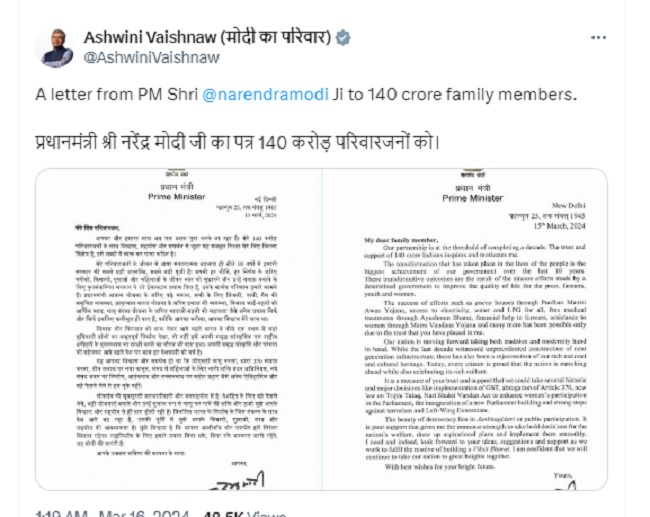 नई दिल्ली : प्रधानमंत्री नरेन्द्र मोदी ने ‘मेरे प्रिय परिवारजन’ को संबोधित एक चिट्ठी लिखी है। इसे भारतीय जनता पार्टी के अनेक नेताओं और मंत्रियों ने सोशल मीडिया में साझा किया है। 15 मार्च को लिखी गई प्रधानमंत्री की इस चिट्ठी को केंद्रीयमंत्री अश्विनी वैष्णव ने आज (रात 1ः19 बजे) एक्स हैंडल पर साझा करते हुए लिखा है-”प्रधानमंत्री श्री नरेंद्र मोदी जी का पत्र 140 करोड़ परिवारजनों को। ” प्रधानमंत्री मोदी ने इस चिट्ठी में सरकार के प्रयासों से नागरिकों के जीवन में आए बदलाव को अपनी सबसे बड़ी पूंजी माना है।