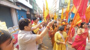 इस शोभायात्रा में गिरिडीह के निवर्तमान विधायक निर्भय कुमार शाहाबादी ने मकतपुर अवस्थित रानीलक्ष्मी बाई स्कूल के पास सभी श्रद्धालुओं पर पुष्प वर्षा की एवम शोभायात्रा में शामिल भक्तों के लिए शुद्ध पेयजल का वितरण किये।इस पुष्पवर्षा कार्यक्रम में निर्भय कुमार शाहाबादी के साथ दीपक स्वर्णकार,हबलु गुप्ता,मोती लाल उपाध्याय, नरेंद्र सिंह पचम्बा,बैभव शाहाबादी,अशोक सिंह,दीपक शर्मा,प्रकाश दास,ओमप्रकाश गुप्ता,गोबिंद तुरी,सुरेश गुप्ता,सुबोध सिंह,सहित दर्जनों कार्यकर्ता उपस्थित थे।