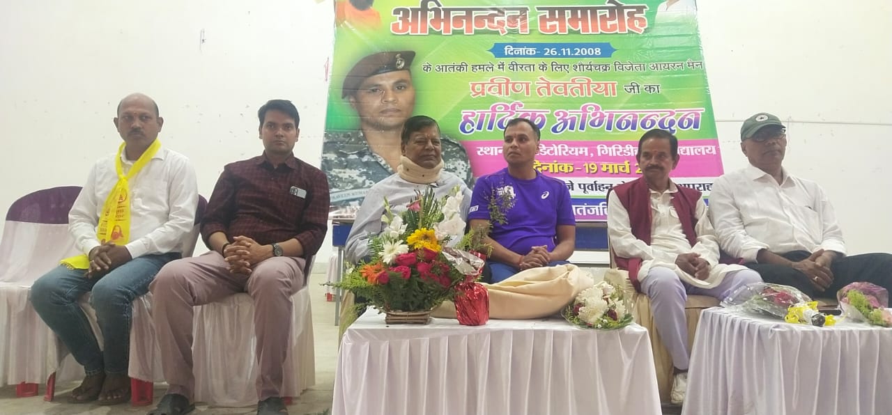 गिरिडीह : 26/11 के मुंबई आतंकी हमले में अपनी जान की परवाह न करते हुए| आतंकवादियों को ढेर करने वाले शौर्य चक्र विजेता मार्कोस कमांडोज प्रवीण तेवतिया भारत स्वाभिमान के तत्वाधान में योग शिविर और युवाओं को राष्ट्र सेवा और योग के प्रति प्रेरित करने के लिए गिरिडीह पहुंचे| प्रातः काल कबीर ज्ञान मन्दिर में उन्होंने पतंजलि परिवार के कार्यकर्ताओं को योग का प्रशिक्षण दिया| तत्पश्चात गिरिडीह कॉलेज सभागार में सैकड़ो युवाओं को संबोधित करते हुए उन्होंने कहा कि हम अपने जन्म और मृत्यु को तय नहीं कर सकते| परंतु अपने जीवन काल में अपने भाग्य के निर्माता हम स्वयं हैं| मन के हारे हार है मन के जीते जीत इस कहावत को चरितार्थ करने वाले तीन बार आयरन मैन का खिताब हासिल करने वाले प्रवीण  को सुनकर युवा आत्मविश्वास से लवरेज हो गए|