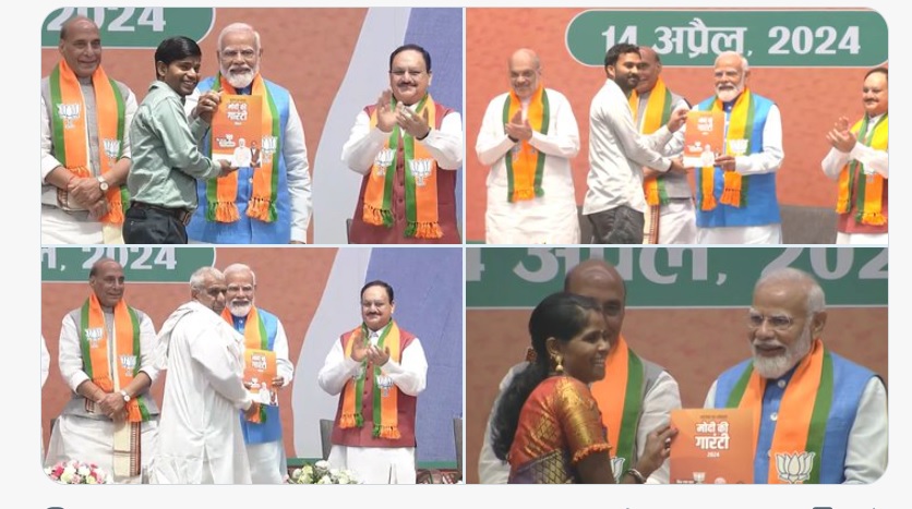नई दिल्ली : प्रधानमंत्री एवं भारतीय जनता पार्टी के वरिष्ठ नेता नरेन्द्र मोदी ने रविवार को पार्टी के संकल्प पत्र को 140 करोड़ देशवासियों की एंबीशन (आकांक्षाओं) पूरा करने का मिशन बताया। उन्होंने कहा कि संकल्प पत्र युवा, नारी, गरीब और किसान को सशक्त करने की हमारी सोच से प्रेरित है। भाजपा लोगों को सम्मान के साथ गुणवत्तापूर्ण जीवन और नए अवसर देना चाहती है। उन्होंने एकसाथ राज्यों और केन्द्र में चुनाव और समान नागरिक संहिता पर जोर देते हुए अपने अगले कार्यकाल में भ्रष्टाचारियों पर सख्त कार्रवाई की गारंटी दी।
