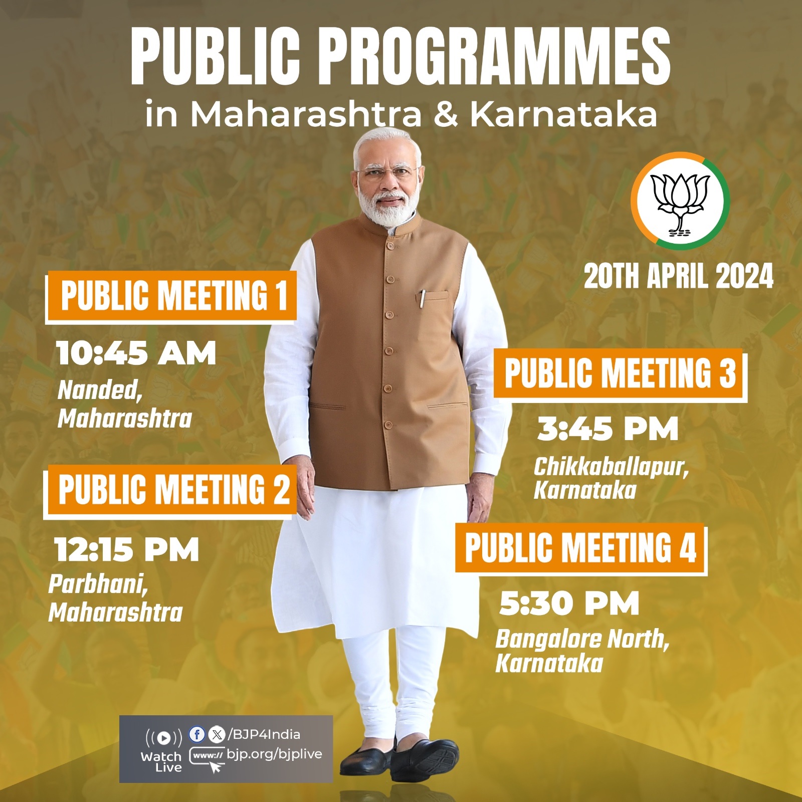 भाजपा की इस पोस्ट के मुताबिक महाराष्ट्र के दौरे के बाद प्रधानमंत्री मोदी कर्नाटक पहुंचेंगे। वो कर्नाटक के चिक्काबल्लापुरा दोपहर बाद पौने चार बजे भारतीय जनता पार्टी की जनसभा को संबोधित करेंगे। इसके बाद शाम को वो बेंगलुरु नार्थ में होंगे। प्रधानमंत्री यहां भारतीय जनता पार्टी की जनसभा को संबोधित करेंगे। बेंगलुरु ब्यूरो के मुताबिक प्रधानमंत्री मोदी के कर्नाटक दौरे के मद्देनजर बेंगलुरु ट्रैफिक पुलिस ने कृष्णा विहार, पैलेस ग्राउंड और एचक्यूटीसी हेलीपैड पर एक किलोमीटर के दायरे में अस्थायी नो-फ्लाई जोन घोषित किया है।