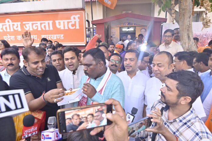 रांची : भाजपा प्रदेश कार्यालय में मंगलवार को लोकसभा चुनाव परिणाम के बाद जमकर पटाखे फोड़े गए। अबीर गुलाल लगाकर नेताओं कार्यकर्ताओं ने बधाईयां दी, लड्डू खिलाए और ढोल नगाड़ों पर खूब थिरके।