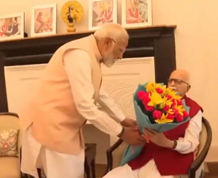 मुलाकात के दौरान आडवाणी की बेटी प्रतिभा भी वहां मौजूद रहीं। तीसरी बार प्रधानमंत्री बनने जा रहे मोदी ने गुलदस्ता देकर उनका अभिवादन किया। उल्लेखनीय है कि पिछली बार प्रधानमंत्री के तौर पर नेता चुने जाने के दौरान दोनों वरिष्ठ नेता, मोदी के साथ सभागार में मौजूद थे।
