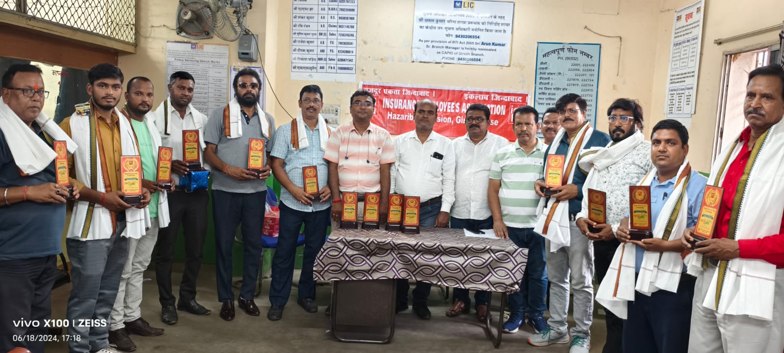गिरिडीह : अखिल भारतीय बीमा कर्मचारी संघ गिरिडीह शाखा की ओर से मंगलवार को एलआईसी शाखा परिसर में एक सम्मान समारोह कार्यक्रम आयोजित किया गया। इसमें उत्कृष्ट विकास अधिकारी, मुख्य बीमा सलाहकार तथा अभिकर्ताओं को शिल्ड, उपहार तथा अंग वस्त्र देकर सम्मानित किया गया। कार्यक्रम की जानकारी देते हुए संघ के सचिव धर्म प्रकाश ने कहा कि हमारे संगठन अखिल भारतीय बीमा कर्मचारी संघ ने एक दिन में अधिकतम बीमा करवाने का लक्ष्य लिया, जिसके तहत विकास अधिकारी ,मुख्य बीमा सलाहकार तथा अभिकर्ताओं से आग्रह किया कि 13 मार्च 2024 को ” मेरा निगम मेरा गौरव ” कार्यक्रम के तहत अधिक से अधिक बीमा व्यवसाय किया जाए। इस कार्यक्रम के तहत गिरिडीह शाखा ने 695 नव व्यवसाय कर हजारीबाग मंडल में प्रथम स्थान प्राप्त किया। इस कार्यक्रम में उत्कृष्ट प्रदर्शन के लिए आज दो विकास अधिकारी अमित कुमार डे तथा अमरनाथ मंडल, मुख्य बीमा सलाहकार अशोक कुमार गुप्ता एवं 11 अभिकर्ताओं को सम्मानित किया गया। साथ ही साथ कल दिनांक 19 जून को मंडल कार्यालय में मंडल स्तर के सर्वोच्च 25 अभिकर्ताओं एवं दो विकास अधिकारियों को सम्मानित किया जाएगा। इस कार्यक्रम में वरीय शाखा प्रबंधक अरुण कुमार, शाखा प्रबंधक सुमित कुमार गुप्ता ,सहायक शाखा प्रबंधक विकास पाण्डेय, संघ के अध्यक्ष संजय शर्मा, संयुक्त सचिव अनुराग मुर्मू, विजय कुमार एवं राजेश कुमार उपाध्याय सहित कई कर्मचारियों तथा अभिकर्ताओं ने हिस्सा लिया।