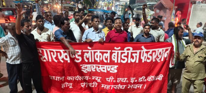 गिरिडीह : झारखंड लोकल बाडीज फेडरेशन के बैनर तले नगर निकाय के कर्मीयों ने लगातार चौथे दिन शुक्रवार को निगम कार्यालय से मशाल जुलूस निकाला।ये अपनी 5 सूत्री मांगो को लेकर आन्दोलन का बिगुल फूंक दिया है।बताया गया कि पुरे राज्यभर के निकाय कर्मी 23 से 27 जुलाई तक मशाल जुलूस निकालकर कर विरोध प्रकट करेंगे. इसके बाद मुख्यमंत्री के समक्ष निगम कर्मी रैली निकालेंगे. इसके बाद भी अगर सरकार की ओर से कोई पहल नहीं की जाती है तो अगस्त महीने से कर्मी अनिश्चितकालीन हड़ताल पर चले जायेंगे. मशाल जुलूस का नेतृत्व फेडरेशन के प्रदेश अध्यक्ष अशोक कुमार सिंह ने किया. जबकि मौके पर अध्यक्ष अंजीक चंद्रा, सचिव लखन हरिजन,मृत्युंजय सिंह,, मो साबिर, राजेश सिंह, शम्भू सिंह, गौरीशंकर यादव, सुभाष शर्मा, रोहित सिंह आदि मौजूद थे. शहर के टावर चौक होते हुवे मशाल जुलूस शहर के प्रमुख मार्गों का भ्रमण किया. इस दौरान सभी ने जोरदार नारेबाजी करते हुए अपने 5 सूत्री मांगों को पूरी करने का आह्वान सरकार से किया।