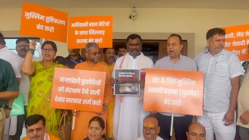 वही बांग्लादेशी घुसपैठ के मामले पर विरोध प्रदर्शन कर रहे झारखंड विधानसभा विपक्ष के नेता बाबूलाल मरांडी ने कहा कि झारखंड में आदिवासियों की संख्या कम होती जा रही है | और बांग्लादेशी रोहिंग्या मुसलमान अपना मतदाता सूची में नाम दर्ज करते जा रहे हैं जमीन जाएगा पेश कर रहे हैं | राशन कार्ड में अपना नाम दर्ज कर रहे हैं और उन्हें हेमंत सरकार पाल पोस रहे हैं |