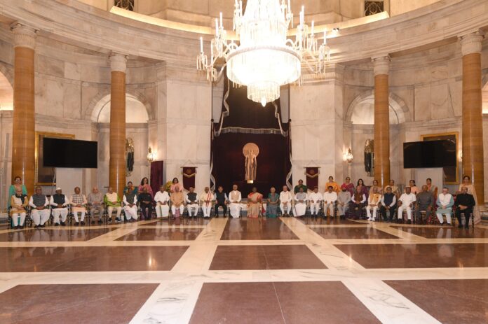 नई दिल्ली : राष्ट्रपति द्रौपदी मुर्मू की अध्यक्षता में देश के सभी राज्यों के राज्यपालों का पहला दो दिवसीय (2-3 अगस्त) सम्मेलन आज से नई दिल्ली में शुरू हो रहा है। राष्ट्रपति द्रौपदी मुर्मू ने सम्मेलन शुरू होने की पूर्व संध्या पर राष्ट्रपति भवन में राज्यपालों और उनके जीवनसाथियों से मुलाकात की। इस मुलाकात के फोटो राष्ट्रपति भवन के एक्स हैंडल पर साझा किए गए हैं।