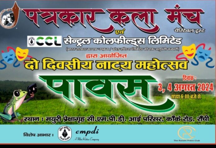 रांची : पत्रकार कला मंच और सीसीएल के संयुक्त तत्वाधान में दो दिवसीय नाट्य महोत्सव ’पावस’ का शुभारंभ सीएमपीडीआई के मयूरी प्रेक्षागृह में शाम के 6 बजे होना है।