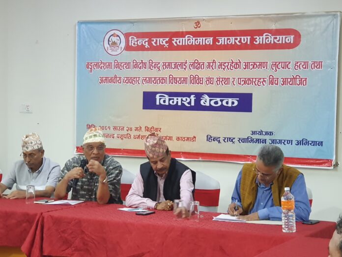 हिन्दू राष्ट्र स्वाभिमान जागरण अभियान ने काठमांडू में एक कार्यक्रम में वक्ताओं ने बांग्लादेश में हिन्दुओं के साथ हो रहे अत्याचार पर गंभीर चिंता जताई। इस कार्यक्रम में करीब पचास से अधिक धार्मिक तथा सामाजिक संगठनों के प्रतिनिधियों ने हिस्सा लिया। वक्ताओं ने इस मसले पर एकजुट होने का आह्वान किया। साथ ही नेपाल की चुप्पी पर भी आश्चर्य जताया।