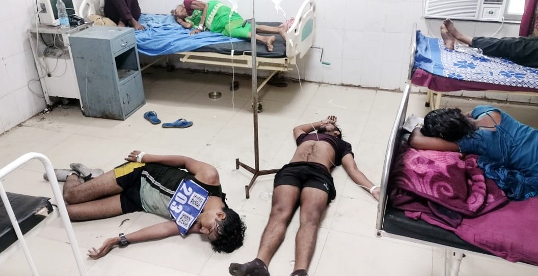 पलामू : मेदिनीनगर के चियांकी हवाई अड्डे पर उत्पाद सिपाही भर्ती दौड़ प्रतियोगिता में गुरुवार को 25 अभ्यर्थी बेहोश हो गए थे। अभ्यर्थियों को इलाज के लिए मेदिनीराय मेडिकल कॉलेज एंड हॉस्पीटल में भर्ती करवाया गया था, जहां अस्पताल के फर्श पर बेहोश अभ्यर्थी को लिटा दिया गया था और स्लाइन चढ़ाने के दौरान लापरवाही बढ़ती जा रही थी।