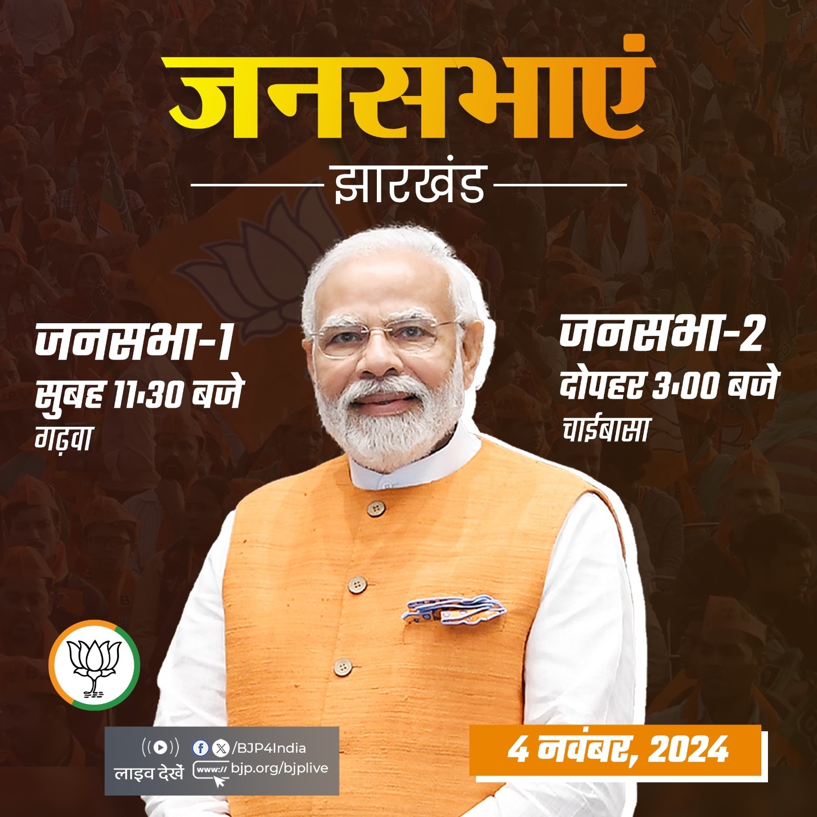 भाजपा के अनुसार, पार्टी के शीर्ष नेता और प्रधानमंत्री मोदी सुबह 11ः30 बजे गढ़वा में जनसभा को संबोधित करेंगे। इसके बाद वो चाईबासा पहुंचेंगे। प्रधानमंत्री चाईबासा में दोपहर तीन बजे भाजपा की जनसभा को संबोधित करेंगे।