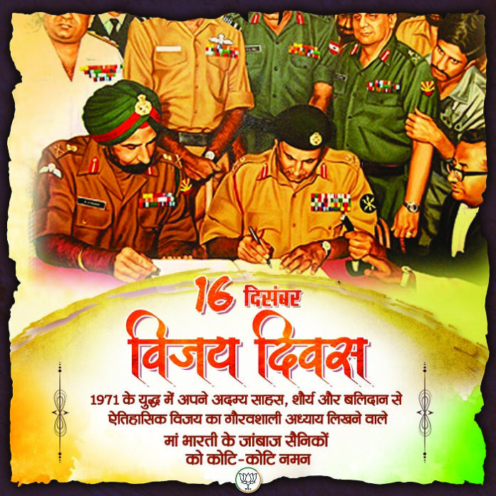 केंद्रीय गृह एवं सहकारितामंत्री अमित शाह ने लिखा, ” सभी को विजय दिवस की शुभकामनाएं। विजय दिवस सेना के वीर जवानों के साहस, अटूट समर्पण और पराक्रम की पराकाष्ठा का प्रतीक है। 1971 में आज ही के दिन सेना के वीर जवानों ने न केवल दुश्मनों के हौसले पस्त कर तिरंगे को शान से लहराया, बल्कि मानवीय मूल्यों की रक्षा करते हुए विश्व मानचित्र पर एक ऐतिहासिक बदलाव किया। देश अनंत काल तक अपने रणबांकुरों के शौर्य पर गर्व करता रहेगा।” वहीं, भाजपा ने लिखा, ”1971 के युद्ध में अपने अदम्य साहस, शौर्य और बलिदान से ऐतिहासिक विजय का गौरवशाली अध्याय लिखने वाले मां भारती के वीर सैनिकों को कोटि-कोटि नमन।”