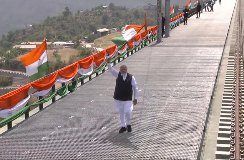 जम्मू-कश्मीर में बने विश्व के सबसे ऊंचे रेलवे ब्रिज ‘चिनाब ब्रिज’ को प्रधानमंत्री नरेंद्र मोदी ने देश को समर्पित कर दिया है | इस दौरान पीएम मोदी हाथ में तिरंगा लेकर चिनाब ब्रिज पर चलते हुए नजर आए | इस दौरान उन्होंने रेलवे के अफसरों और ब्रिज बनाने वाले कर्मचारियों से मुलाकात की।