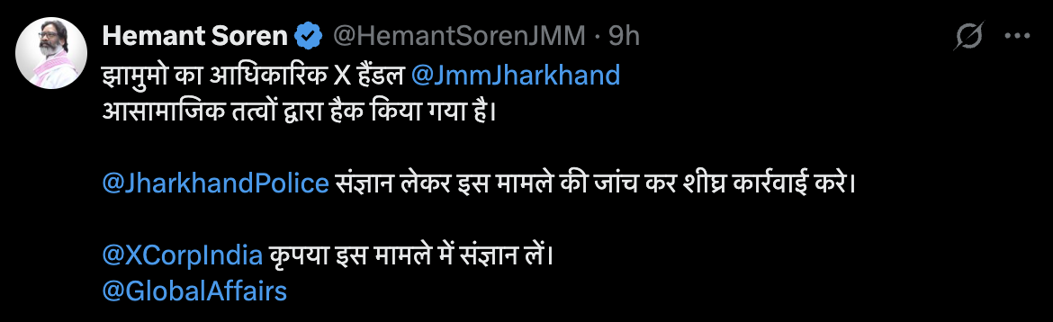 झामुमो का आधिकारिक X हैंडल @JmmJharkhand आसामाजिक तत्वों द्वारा हैक किया गया है। @JharkhandPolice संज्ञान लेकर इस मामले की जांच कर शीघ्र कार्रवाई करे। @XCorpIndia कृपया इस मामले में संज्ञान लें।@GlobalAffairs
