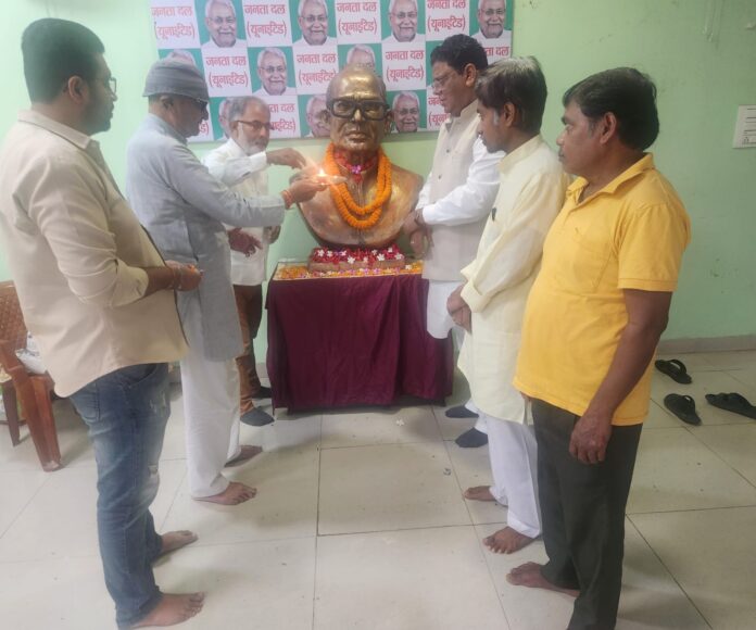 जदयू के महासचिव मनोज कुमार सिन्हा, महासचिव उपेंद्र नारायण सिंह, प्रवक्ता सागर कुमार, प्रदेश कार्यकारिणी सदस्य महेश्वर प्रसाद चौधरी, मिथिलेश कुमार, शुभम गुप्ता, राजेश कुमार सिन्हा सहित कई कार्यकर्ताओं ने सुमन अर्पित किए।