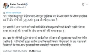 उन्होंने एक्स (X) पर लिखा –“कुरनूल में बस आग हादसे में कई निर्दोषों की मृत्यु अत्यंत दुखद है। बार-बार हो रही ऐसी दुर्घटनाएं सार्वजनिक परिवहन की सुरक्षा पर गंभीर प्रश्नचिह्न हैं। यात्रियों की सुरक्षा सर्वोच्च प्राथमिकता होनी चाहिए।”