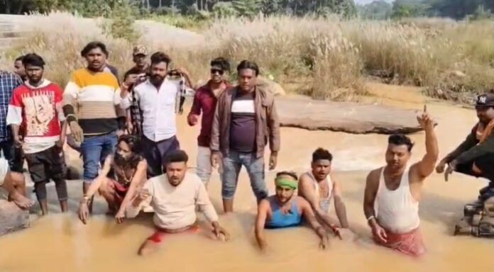 पानी में उतरकर विरोध, प्रशासन के खिलाफ नारेबाजी