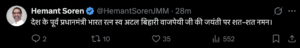 वहीं झारखंड के मुख्यमंत्री हेमंत सोरेन ने भी अटल बिहारी वाजपेयी की जयंती पर उन्हें नमन करते हुए लिखा— “देश के पूर्व प्रधानमंत्री भारत रत्न स्व. अटल बिहारी वाजपेयी जी की जयंती पर शत-शत नमन।”