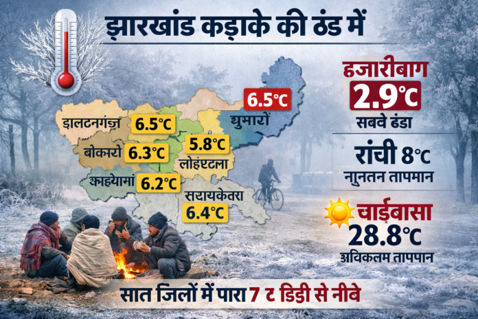 रांची समेत पूरे झारखंड में कड़ाके की ठंड ने लोगों की परेशानी बढ़ा दी है। राज्य के सात जिलों में न्यूनतम तापमान 7 डिग्री सेल्सियस से नीचे चला गया है, जिससे शीतलहर जैसी स्थिति बन गई है। मौसम विभाग के आंकड़ों के अनुसार हजारीबाग राज्य का सबसे ठंडा जिला रहा, जहां न्यूनतम तापमान 2.9 डिग्री सेल्सियस दर्ज किया गया। इसके अलावा डालटनगंज, बोकारो, चाईबासा, खूंटी, लोहरदगा और सरायकेला में भी रात का तापमान 7 डिग्री से नीचे चला गया है।