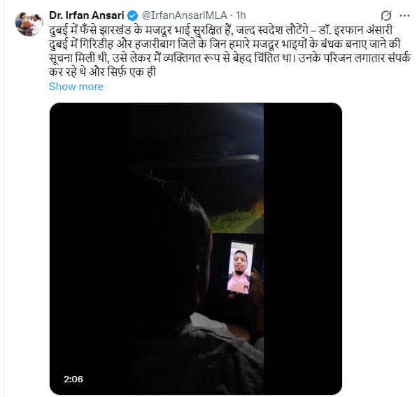 दुबई में फंसे झारखंड के मजदूर सुरक्षित, जल्द लौटेंगे स्वदेश: स्वास्थ्य मंत्री डॉ. इरफान अंसारी
