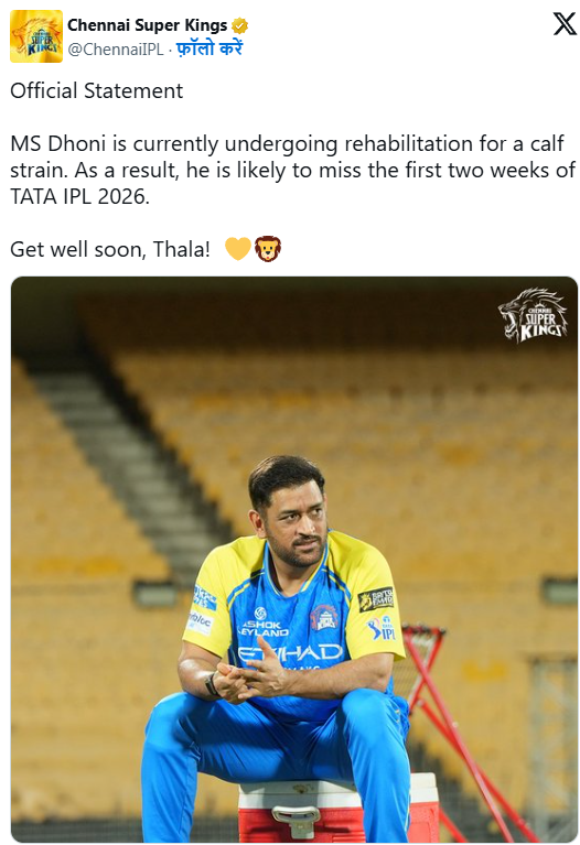 CSK ने 28 मार्च को आधिकारिक बयान जारी कर बताया कि धोनी काफ स्ट्रेन (पिंडली में खिंचाव) से जूझ रहे हैं और फिलहाल रिहैबिलिटेशन प्रक्रिया में हैं। इस कारण वे करीब दो हफ्तों तक टीम से बाहर रहेंगे।