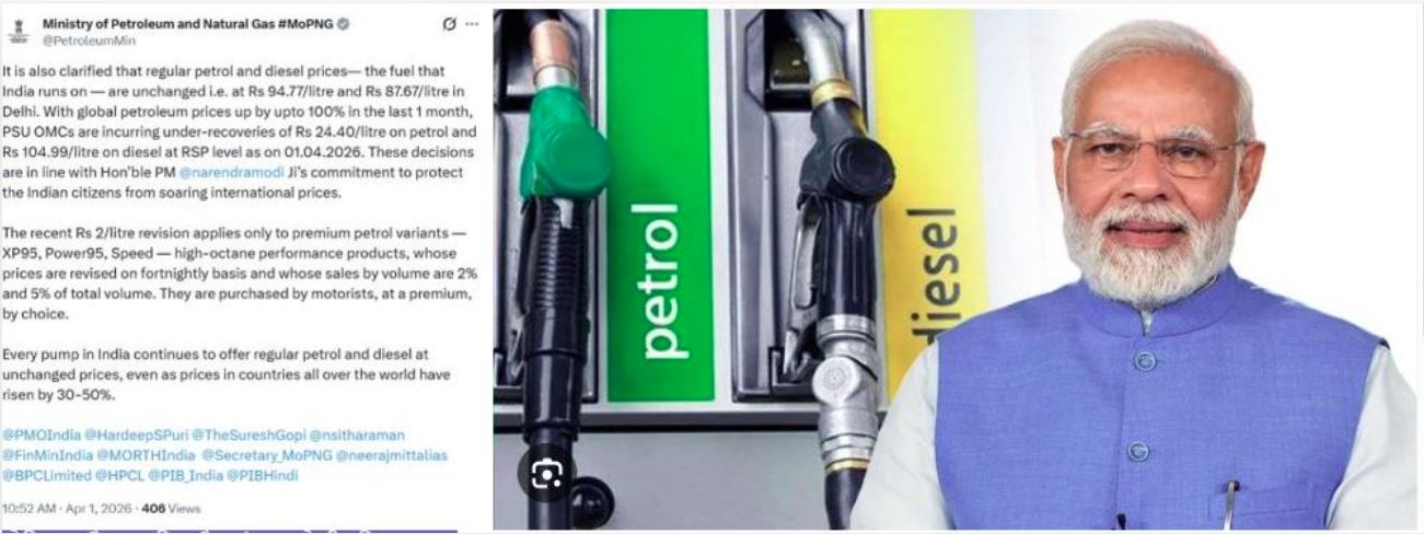 पेट्रोलियम और प्राकृतिक गैस मंत्रालय ने स्पष्ट किया है कि देश में रेगुलर पेट्रोल और डीजल की कीमतों में कोई बदलाव नहीं किया गया है। मंत्रालय के अनुसार, दिल्ली में पेट्रोल की कीमत 94.77 रुपये प्रति लीटर और डीजल 87.67 रुपये प्रति लीटर पर स्थिर है।